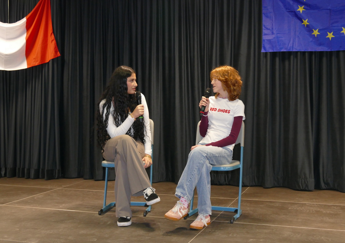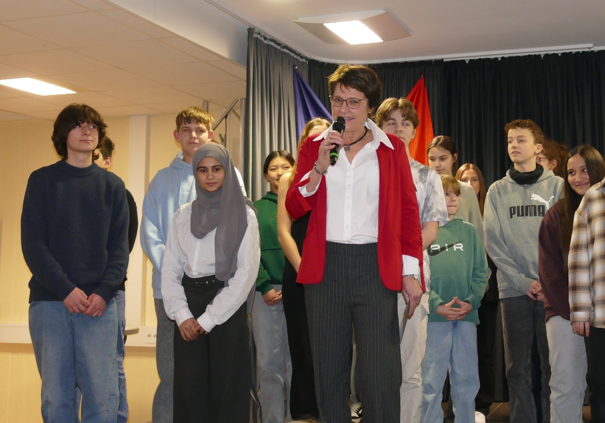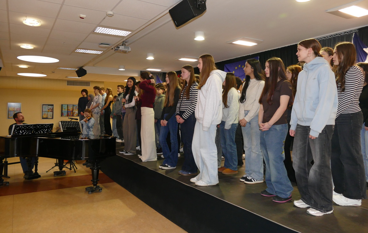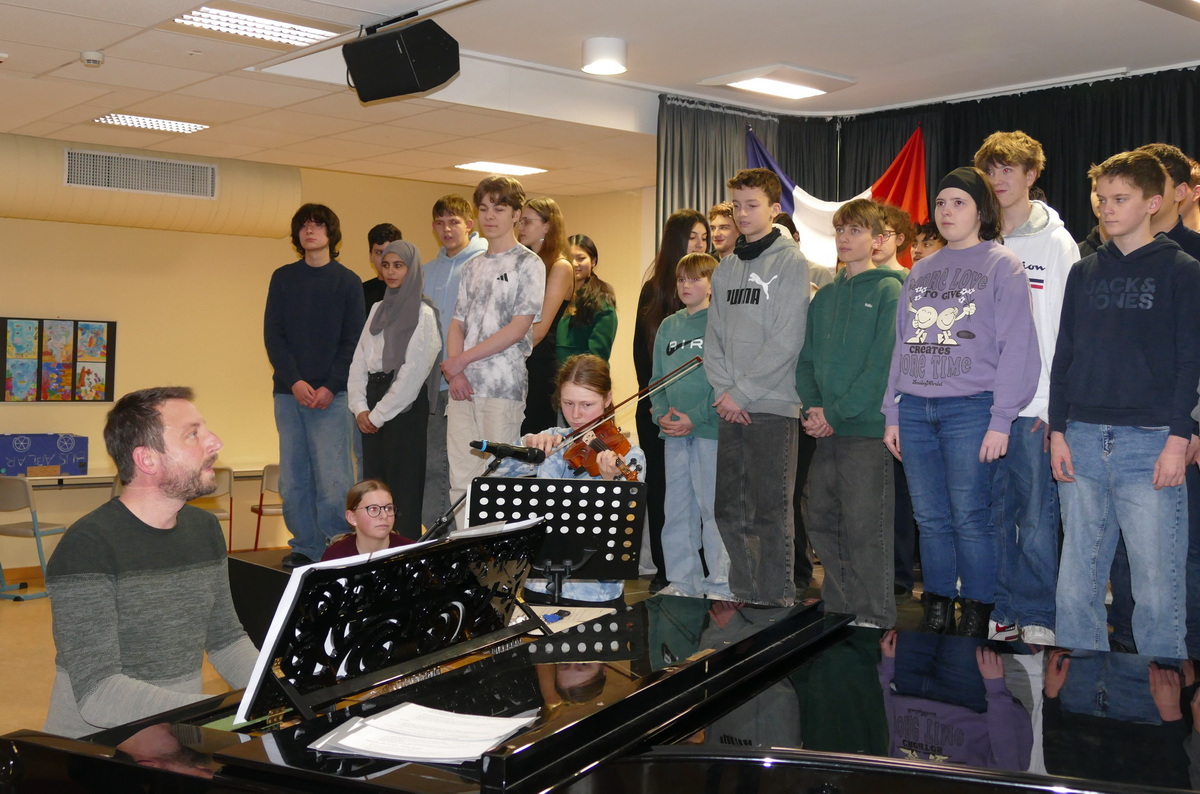 Französischlehrerin Grit Schleiter, die die Moderation übernommen hatte, begrüßte neben dem Attaché auch Malaury Perret vom Institut Franҫais Mainz und den stellvertretenden Schulleiter Lucien Kempe sowie rund 80 Schülerinnen und Schüler der Jahrgänge 7 bis 10, die an der Alexander-Humboldt-Schule Französisch lernen. Mit dem vielstimmig vorgetragenen Lied „On écrit sur les murs“ demonstrierten die Jugendlichen eindrucksvoll, dass gemeinsames Singen Freude machen und neue Zugänge zur Fremdsprache eröffnen kann. Musiklehrer Christoph Daniel am Klavier und zwei Schülerinnen mit Violine und Cajon begleiteten die Sänger.