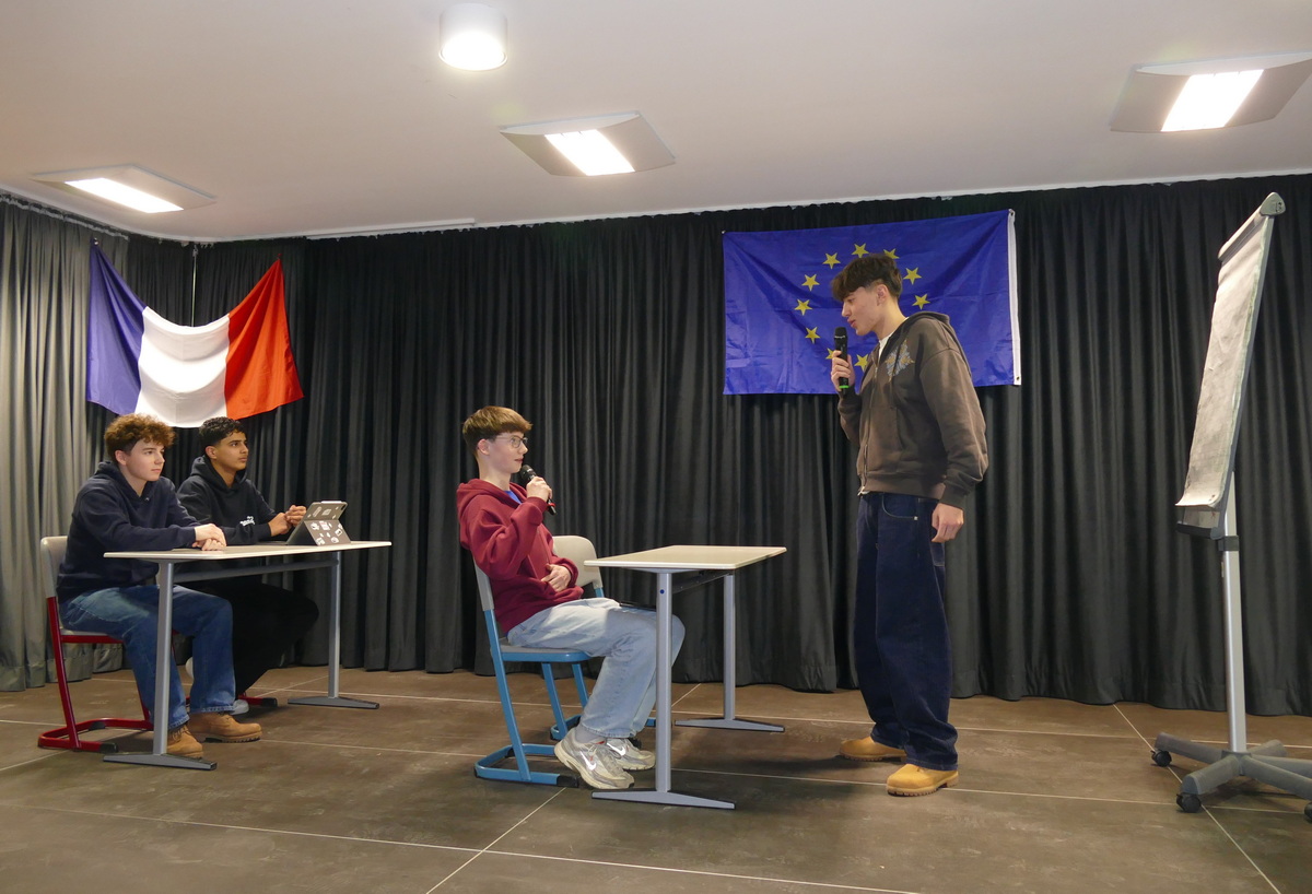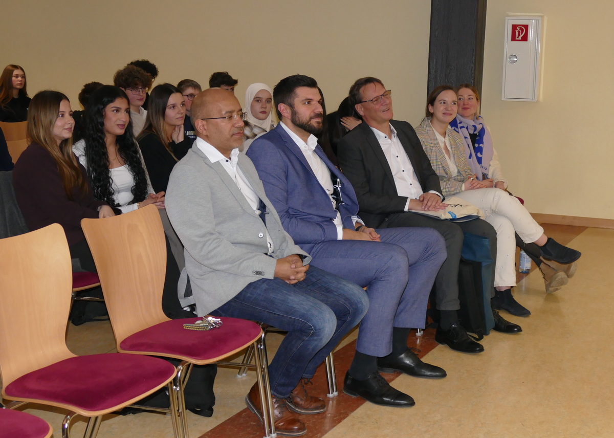 Im Folgenden erläuterte Grit Schleiter, welche Anforderungen beim international anerkannten „DELF scolaire“ zu erfüllen sind und warum es sinnvoll ist, dieses abzulegen. Anhand von zwei Sketchen demonstrierten Zehntklässler, die sich im Rahmen einer AG auf die Prüfung vorbereiten, wie ein Teil der mündlichen Prüfung aussehen kann. Mit ihren sicher und nahezu akzentfrei vorgetragenen Dialogen beeindruckten sie das Publikum. Auch Emmanuel Beaufils zeigte sich sehr angetan vom Gesang der Schüler und dem Sprachniveau der Zehntklässler. Mit einigen Zahlen belegte er die besondere Leistung der Kolleginnen des Fachbereichs, denen es im Lauf der Jahre gelungen war, über 300 Schüler für die Teilnahme an der DELF-Prüfung zu begeistern und einen sehr hohen Prozentsatz zum Erfolg zu führen. „In Aßlar wird nicht nur das Sprachdiplom angeboten, auch der langjährige Schüleraustausch und der regelmäßige Besuch der ,Cinéfête‘ zeugen vom großen Engagement des Fachbereichs“, so Beaufils.