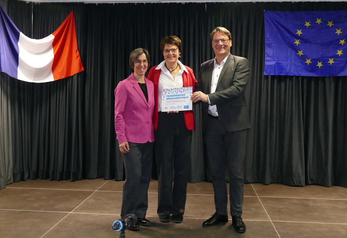 Sein Dank galt ferner dem Institut Franҫais, hier vertreten durch eine der Leiterinnen des Mainzer DELF-Büros, Malaury Perret, deren Professionalität er lobte. „Mehr als 550 000 Menschen weltweit legen das DELF scolaire bzw. die schwierigere Version DALF ab. Deutschland rangiert hier nach Frankreich auf dem zweiten Platz. Die Prüfung ist Bestandteil der Bildungskooperation zwischen Hessen und Frankreich und im letzten Jahr nahmen 219 hessische Schulen teil“, erläuterte der Sprachattaché, bevor er Grit Schleiter und Anke Paul, die seit über 15 Jahren für die Vorbereitung und Organisation in Aßlar verantwortlich zeichnen, eine Plakette überreichte. „Dies ist nicht nur eine Plakette, die wir ins Foyer hängen, sondern dahinter stecken solide Vorbereitung und guter Französischunterricht“, lobte der stellvertretende Schulleiter Lucien Kempe in seiner kurzen Ansprache. Der Fachbereich betreibe nicht nur effektive Sprachausbildung, sondern durch vielfältige Angebote wie den Schüleraustausch auch kulturelle Bildung.