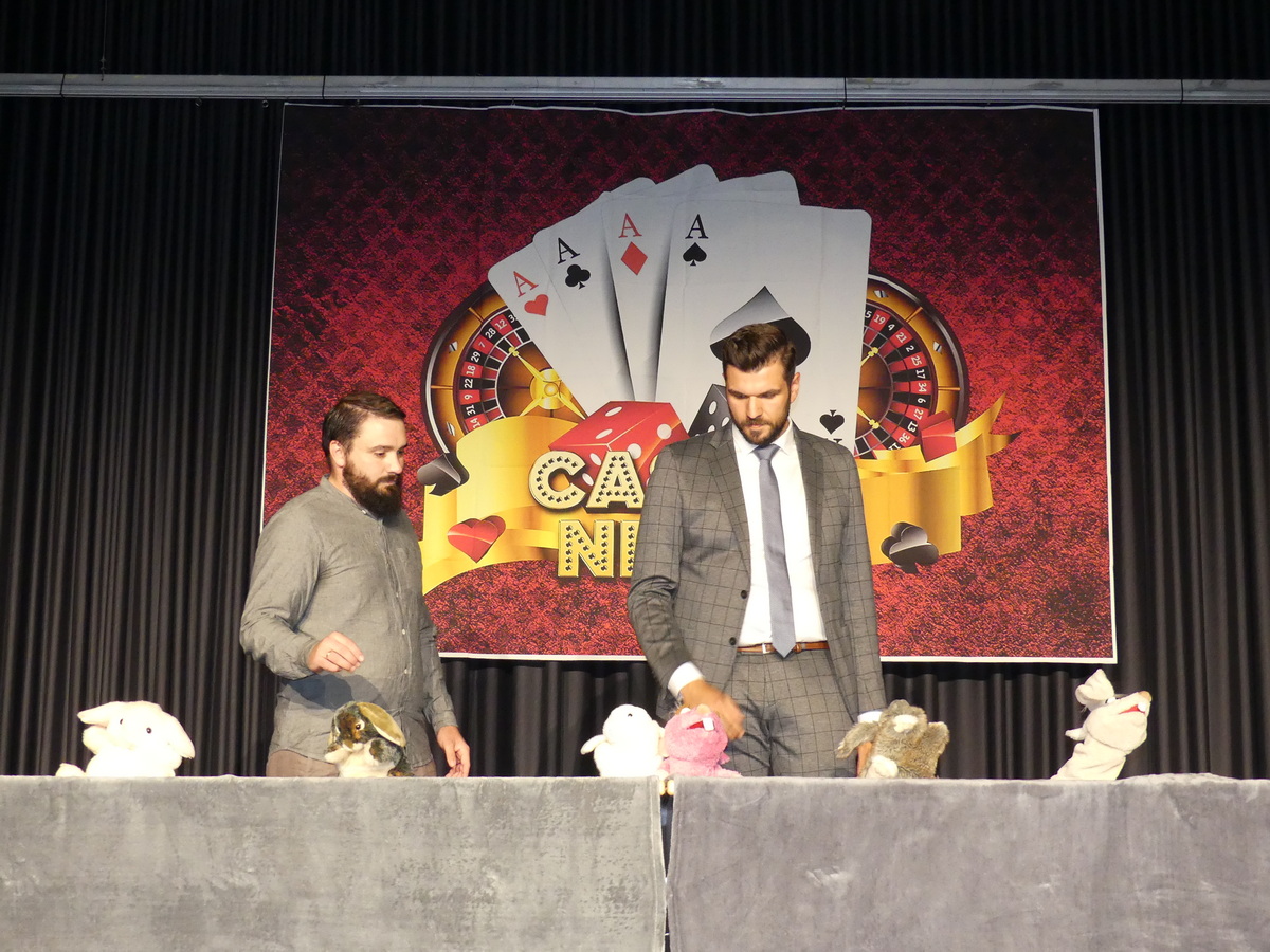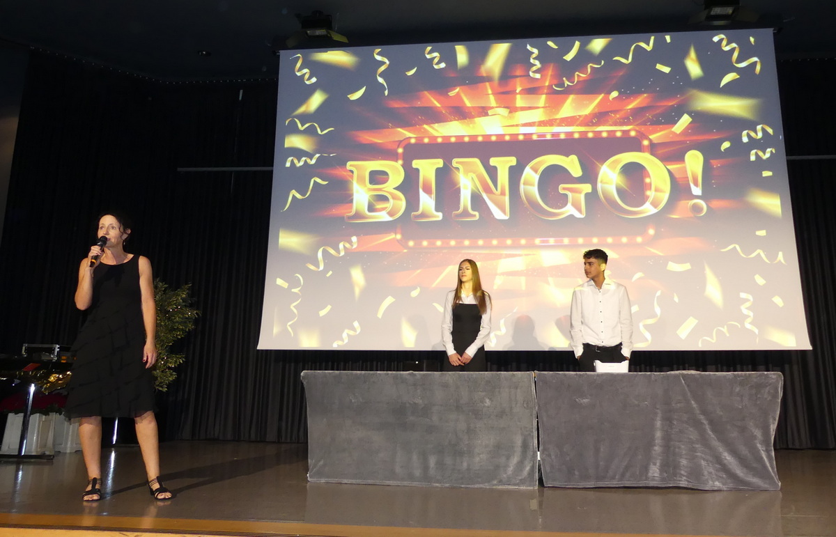 Nun leiteten Victoria Karpinski, Melina Pereira da Silva und Melek Marangoz, die den Abend sehr souverän moderierten, zum ersten von drei Spielen über, die die Lehrer für ein Duell mit den Schülern vorbereitet hatten. Beim Bingo galt es, auf einer Karte mit typischen Lehrer- bzw. Schülersprüchen eine Folge zu erzielen. Dies gelang zuerst einem Schüler, so dass das erste Spiel an die Jugendlichen ging. Es folgte ein bewegender Vortrag der Klasse 10G1, die im Musikunterricht ein Video gedreht hatte, in dem die Schüler auf Keyboards sehr gefühlvoll das Filmmusikstück „Interstellar“ interpretierten.
