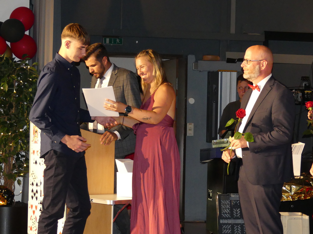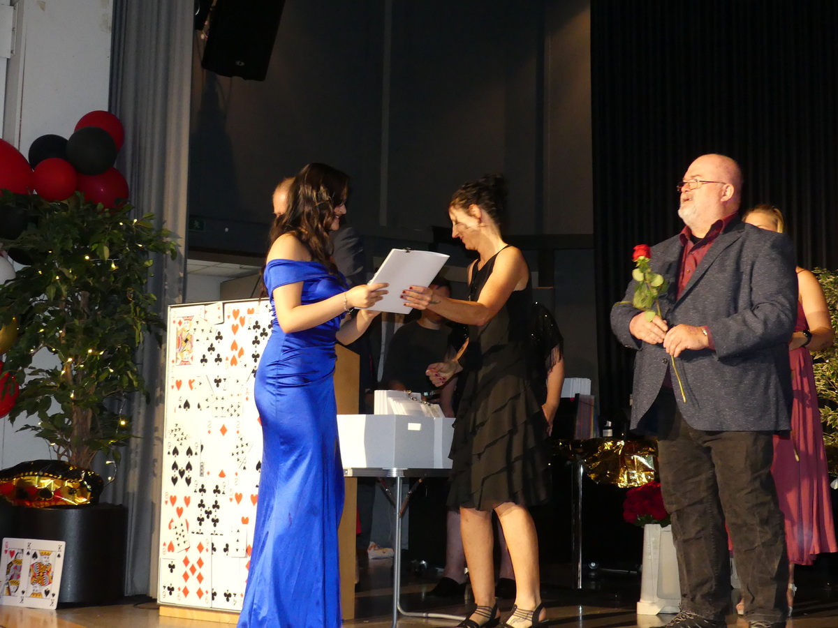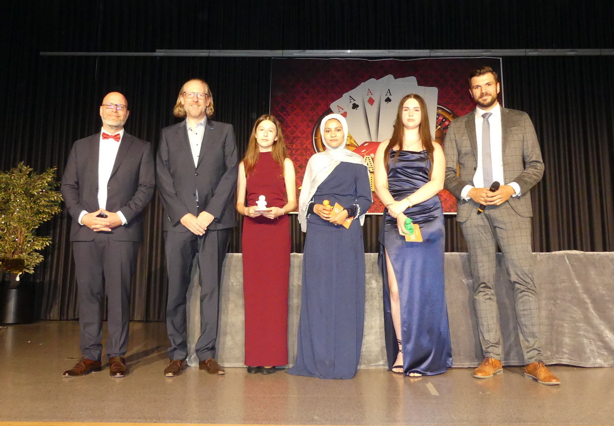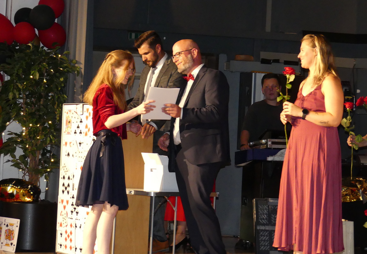 Beim zweiten Spiel des Abends, einem Kahoot mit dem Titel „Name the teacher“, mussten Kinderfotos Lehrern zugeordnet werden. Diesmal gewannen die Pädagogen den Punkt. Es folgte die Ehrung verdienter Schüler durch den Leiter des Gymnasialzweigs Jahrgang 8 bis 10, Jonas Falk, und den für den Haupt- und Realschulzweig zuständigen Rektor Matthias Hund. Dazu gab es erstmals einen von Lorin Sahin entworfenen Award, der zunächst an Jonas Damsch verliehen wurde, der sich beim Projekt „Stadtradeln“ besonders hervorgetan hatte. Ebenfalls ausgezeichnet wurden Isabella Schicker und Samantha Wagner für ihre Mitarbeit beim Schulsanitätsdienst. Für ihren Zeugnisdurchschnitt von 1,7 wurde Ruslana Tarasenko als beste Hauptschülerin geehrt. Den Preis für das beste Realschulzeugnis erhielt Kashifa Mahkan, die einen Durchschnitt von 1,2 erreichte. Nur eine einzige Zwei auf dem Zeugnis hatte sich Emma Köntges geleistet, die damit auf einen Schnitt von 1,1 kam und das Prädikat „Beste Gymnasialschülerin“ erhielt.