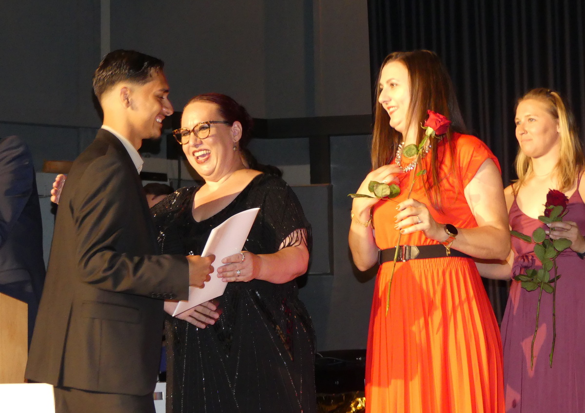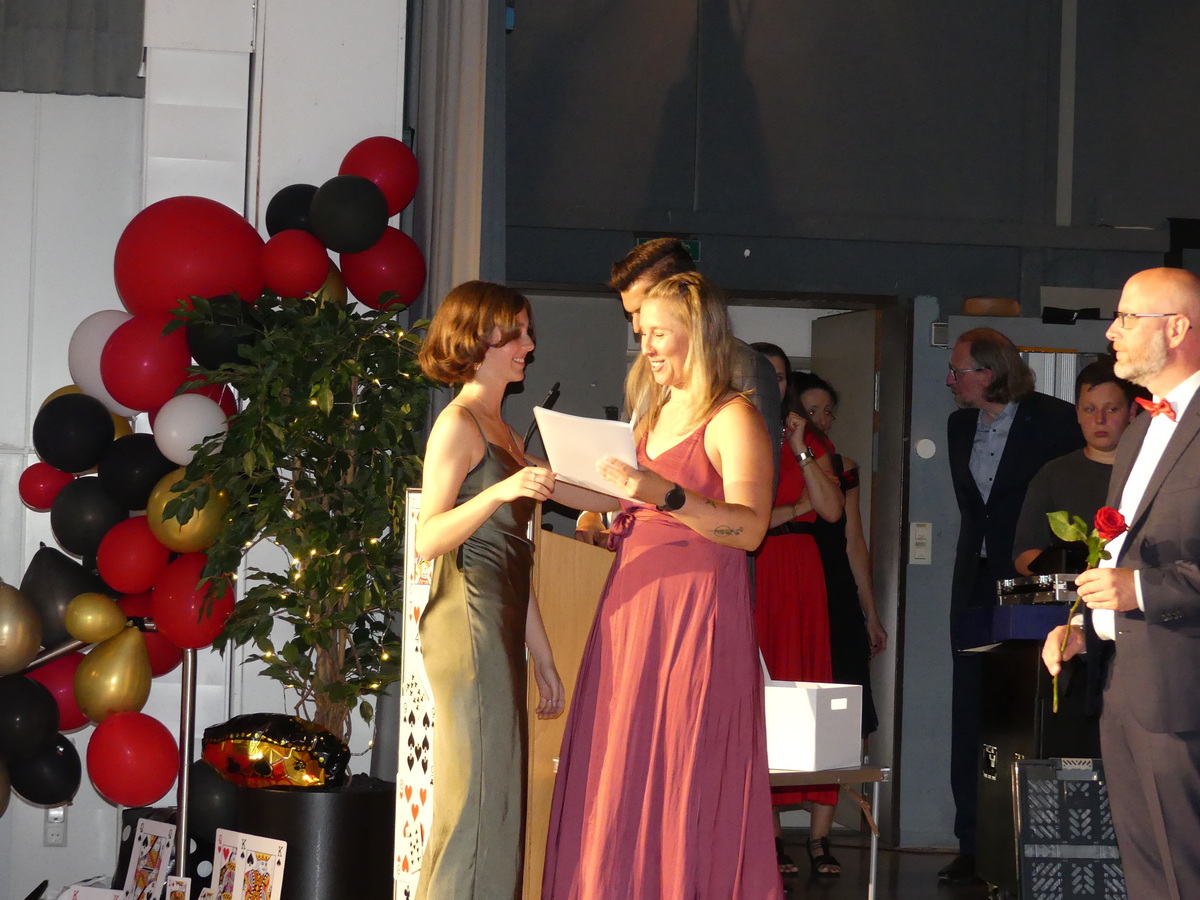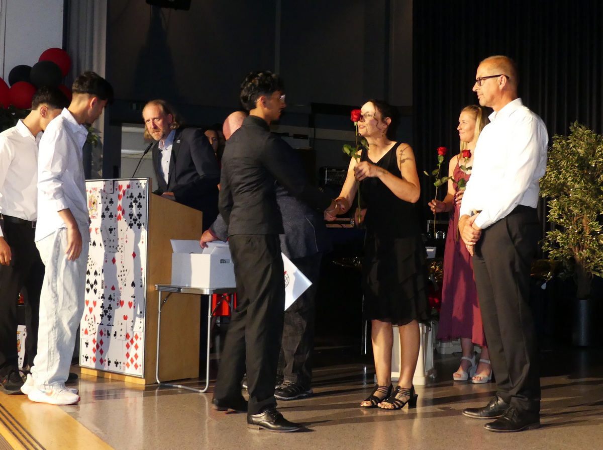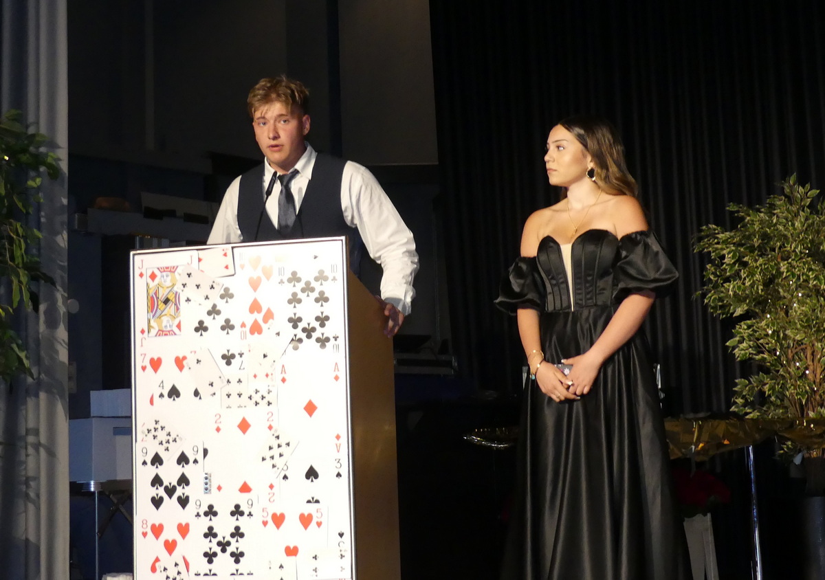 Beim zweiten Spiel des Abends, einem Kahoot mit dem Titel „Name the teacher“, mussten Kinderfotos Lehrern zugeordnet werden. Diesmal gewannen die Pädagogen den Punkt. Es folgte die Ehrung verdienter Schüler durch den Leiter des Gymnasialzweigs Jahrgang 8 bis 10, Jonas Falk, und den für den Haupt- und Realschulzweig zuständigen Rektor Matthias Hund. Dazu gab es erstmals einen von Lorin Sahin entworfenen Award, der zunächst an Jonas Damsch verliehen wurde, der sich beim Projekt „Stadtradeln“ besonders hervorgetan hatte. Ebenfalls ausgezeichnet wurden Isabella Schicker und Samantha Wagner für ihre Mitarbeit beim Schulsanitätsdienst. Für ihren Zeugnisdurchschnitt von 1,7 wurde Ruslana Tarasenko als beste Hauptschülerin geehrt. Den Preis für das beste Realschulzeugnis erhielt Kashifa Mahkan, die einen Durchschnitt von 1,2 erreichte. Nur eine einzige Zwei auf dem Zeugnis hatte sich Emma Köntges geleistet, die damit auf einen Schnitt von 1,1 kam und das Prädikat „Beste Gymnasialschülerin“ erhielt.