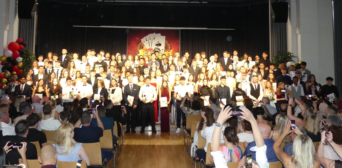 Mit Glamour, Glücksspiel und Musik sind 133 Schülerinnen und Schüler der Alexander-von-Humboldt-Schule in der Aßlarer Stadthalle verabschiedet worden. Unter dem Blitzlichtgewitter unzähliger Handys zogen die Abgänger zu den Klängen von „Poker Face“ über den roten Teppich in den passend zum Motto „Casino Night“ dekorierten Festsaal ein.