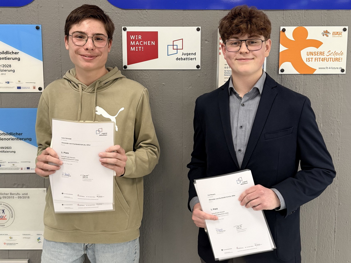 „Soll für E-Scooter eine Führerscheinpflicht eingeführt werden?“ zur Debatte. Eine Lehrerjury beurteilte die Leistungen der Teilnehmer, die jeweils zu zweit einen Standpunkt zu vertreten hatten, nach den Kriterien Sachkenntnis, Ausdrucksvermögen, Gesprächsfähigkeit und Überzeugungskraft. Nachdem sich alle Tandems miteinander gemessen und ihre Standpunkte ausgetauscht hatten und die Schlussrunde beendet war, einigten sich die Juroren auf Leo Peusch als Schulsieger 2026 vor Leon Schmidt. Beide werden die Schule beim Regionalentscheid, der ebenfalls an der Alexander-von-Humboldt-Schule stattfindet, vertreten.